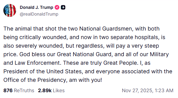 In a social media statement, Trump referred to the shooter as a “beast” and warned that the attacker would “pay a heavy price” for targeting National Guard troops.
